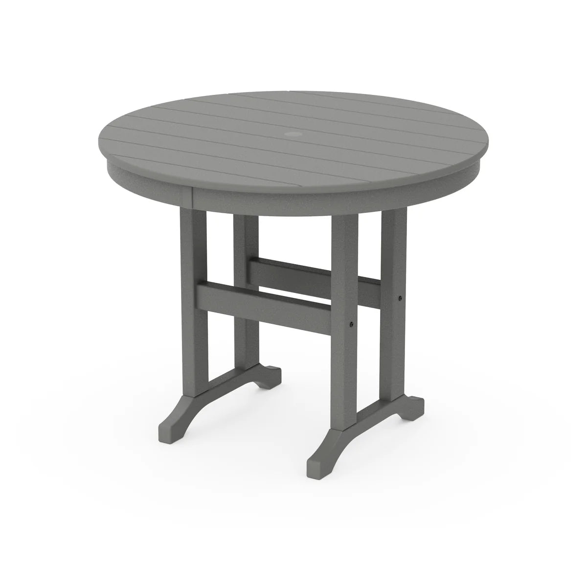 - Slatted tabletop features 1.625" umbrella hole and thin gaps for water drainage